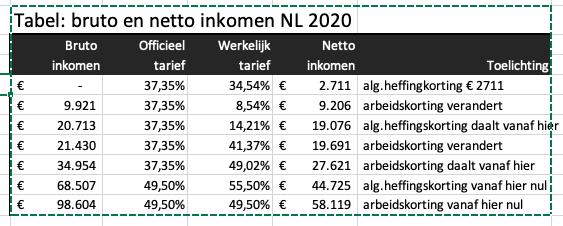 Ja dat is schrikken. Het Nederlandse belastingstelsel is op bepaalde punten niet progressief, maar zelfs degressief. Bijvoorbeeld boven de ton: daar daalt het werkelijke tarief van 55,5% naar 49,5%. Dat komt omdat een salaris boven de ton geen last meer heeft van minder korting: vanaf die grens zijn de kortingen nul. Maar ook eerder: vanaf € 9.921 daalt het belastingtarief scherp van 34,54% naar 8,54%, doordat de arbeidskorting veel sterker stijgt.